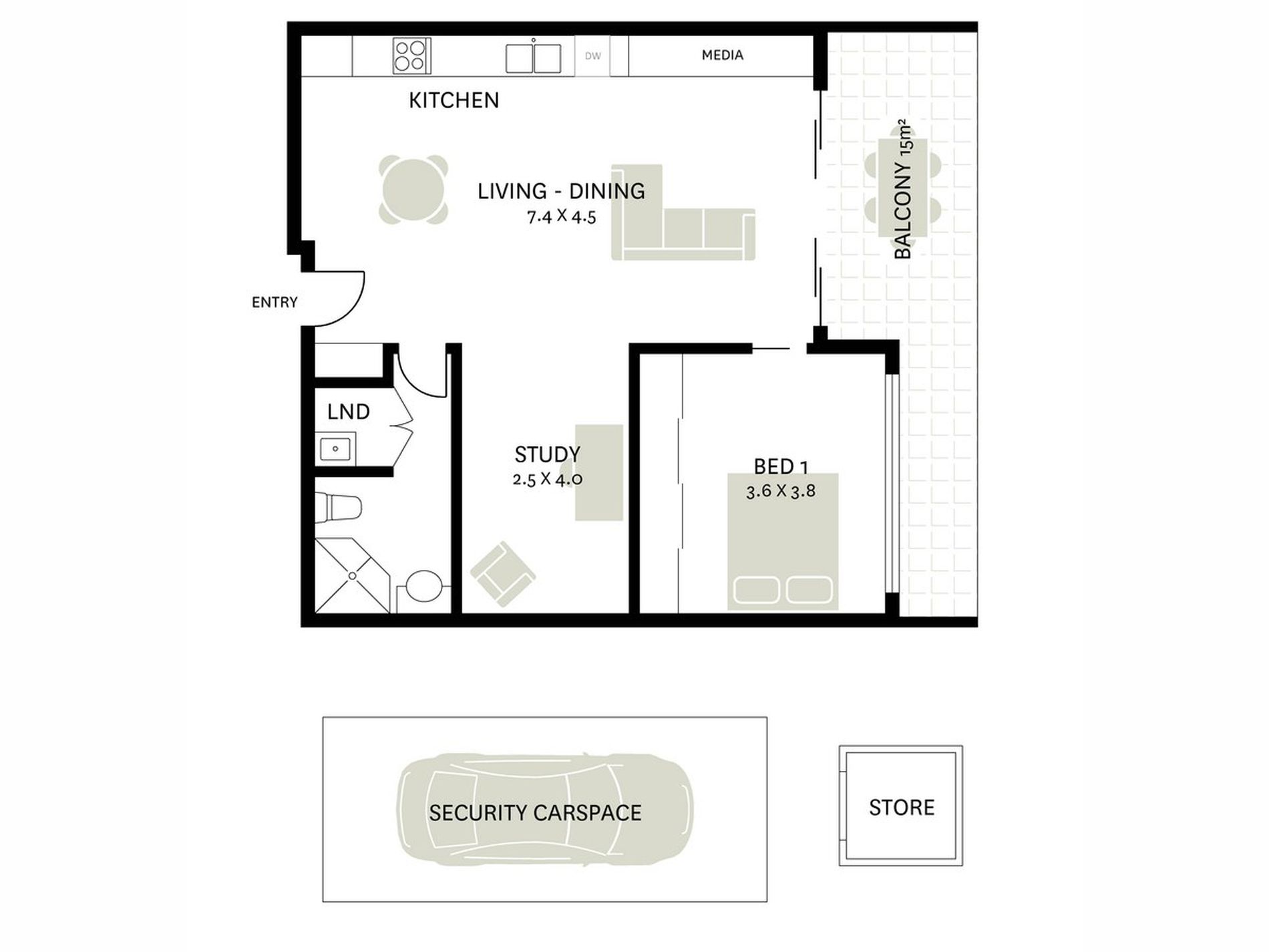The spacious kitchen is beautifully appointed with sleek cabinetry, stone benchtops and stainless steel appliances — designed to impress while remaining highly functional. The generous bedroom features built-in wardrobes and a tranquil outlook, complemented by a modern bathroom finished with timeless materials and clean architectural lines.